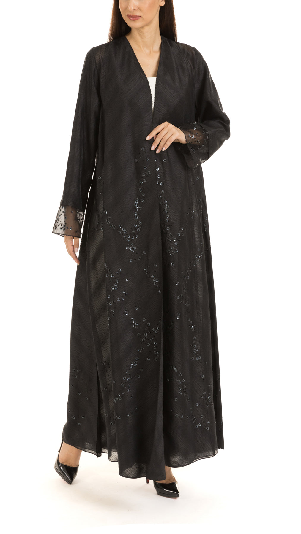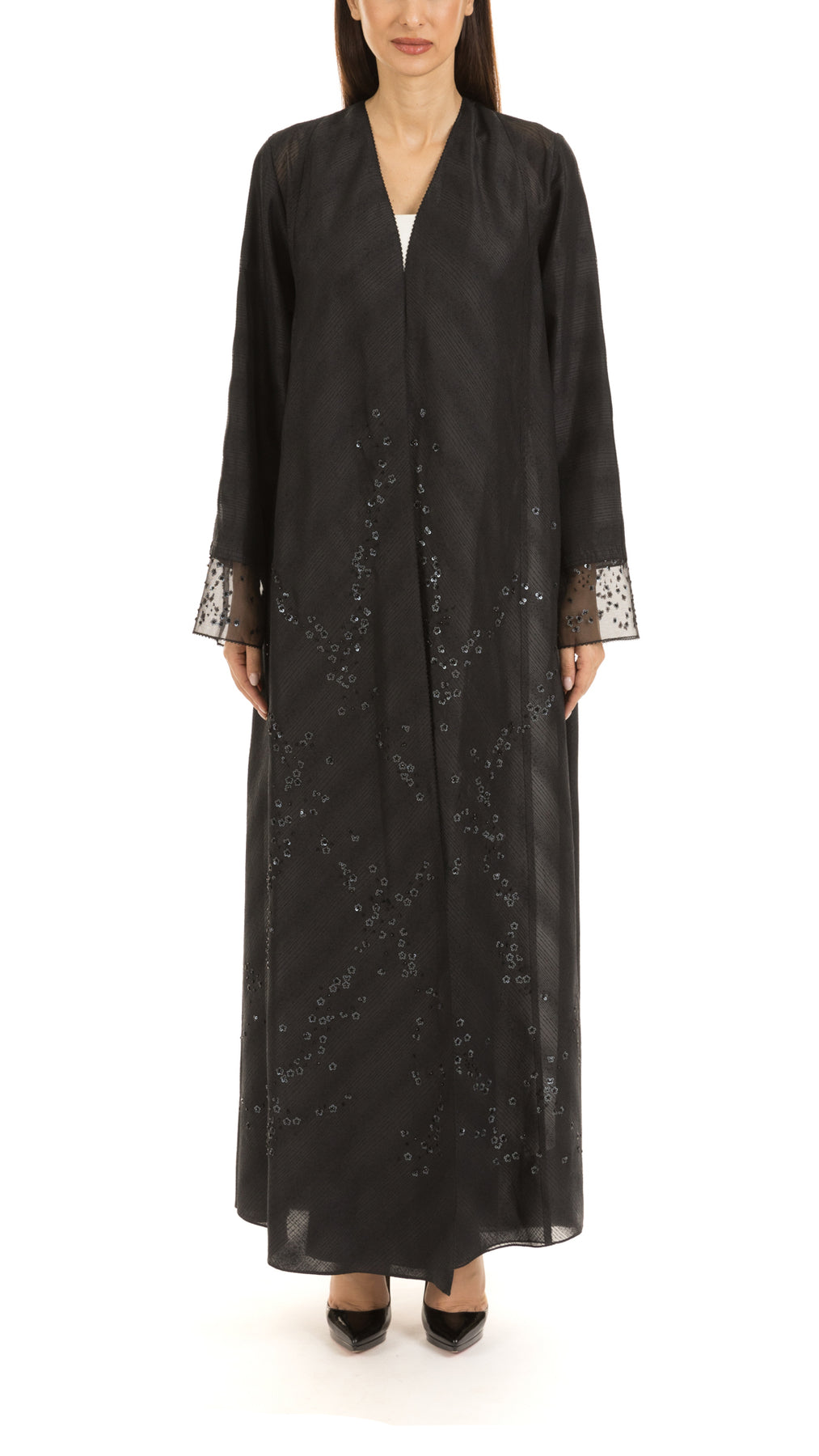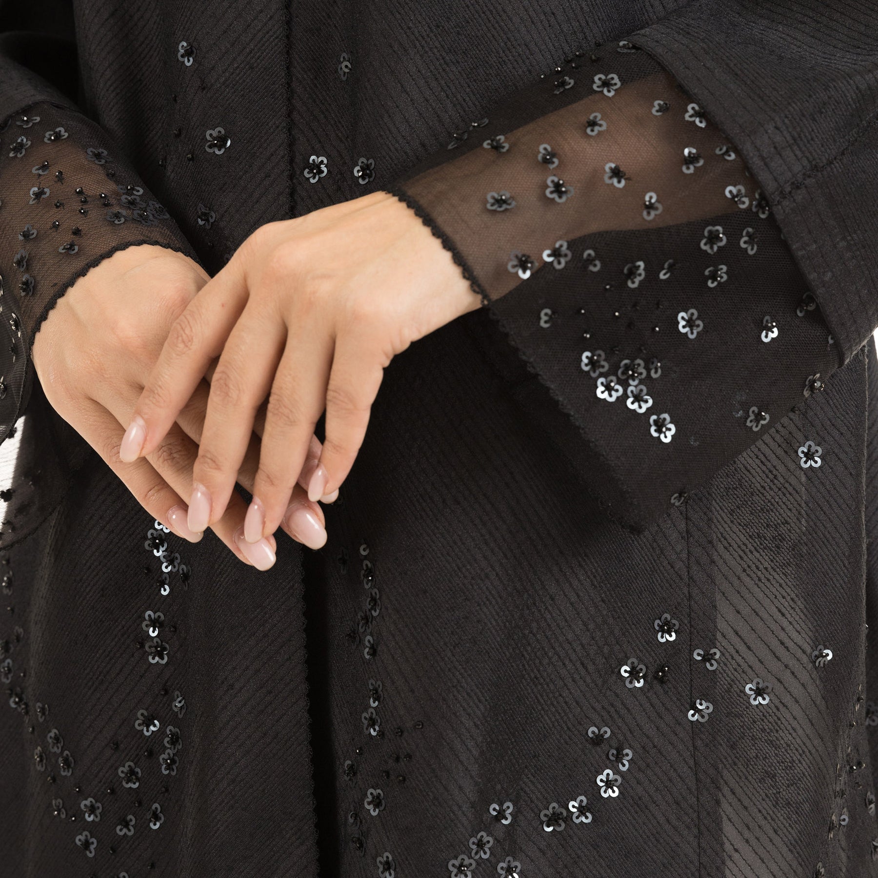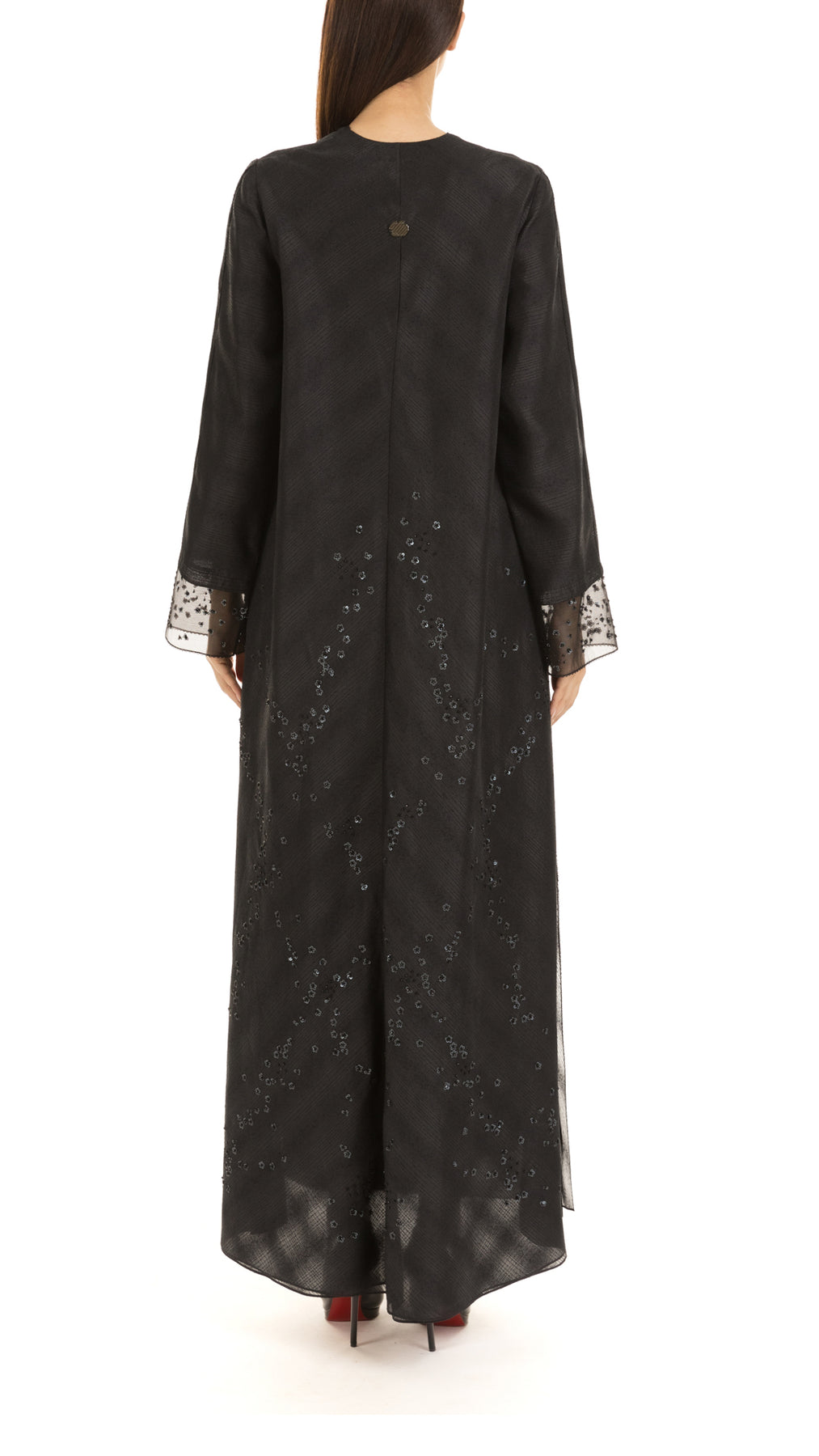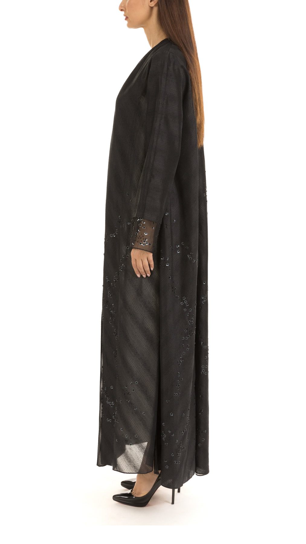 • Signature mauzan abaya with scattered floral hand embellishment & sequins embroidery