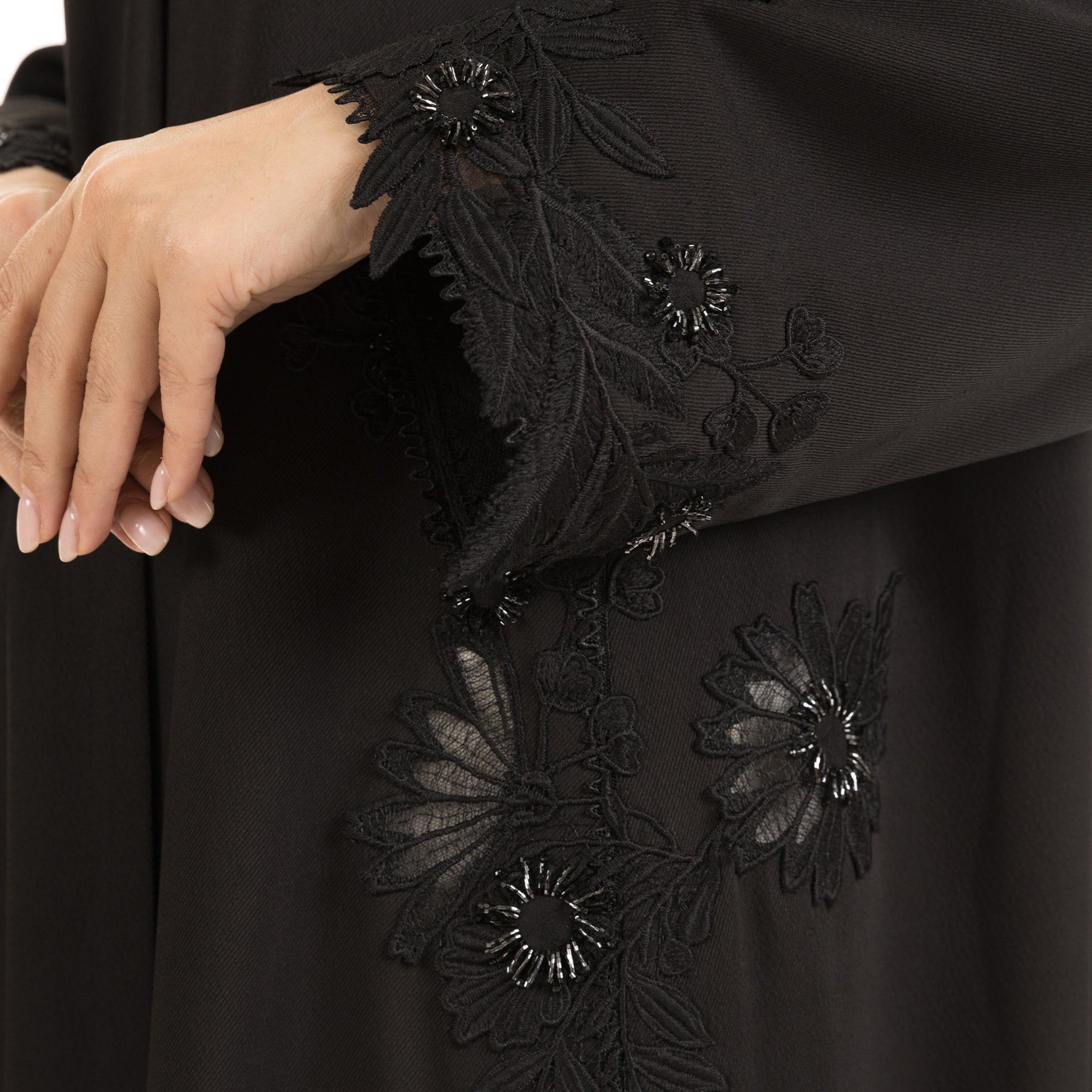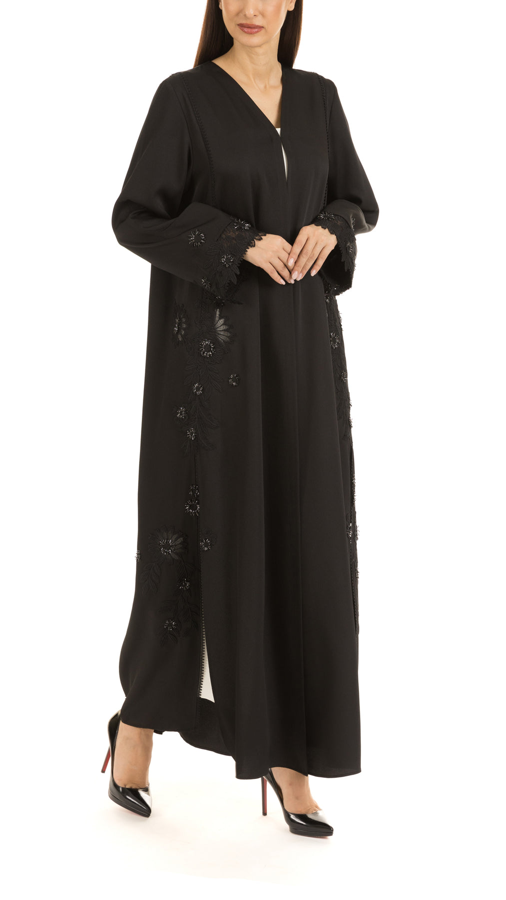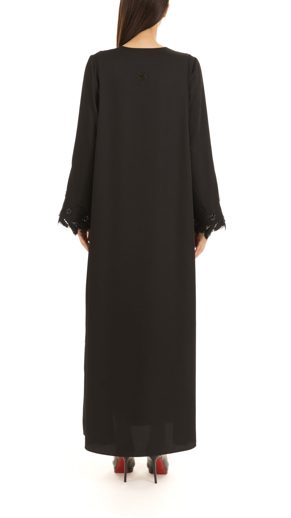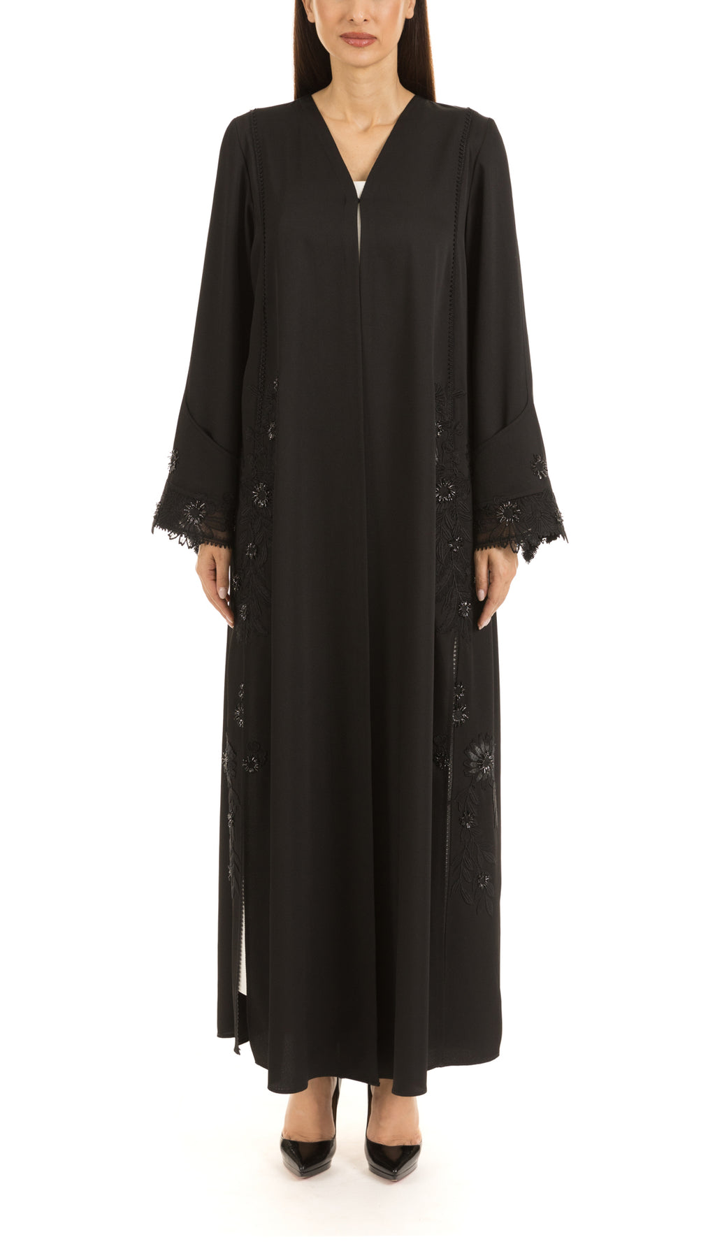 • Mauzan classic cut abaya designed with floral lace along with refined touch of brooch